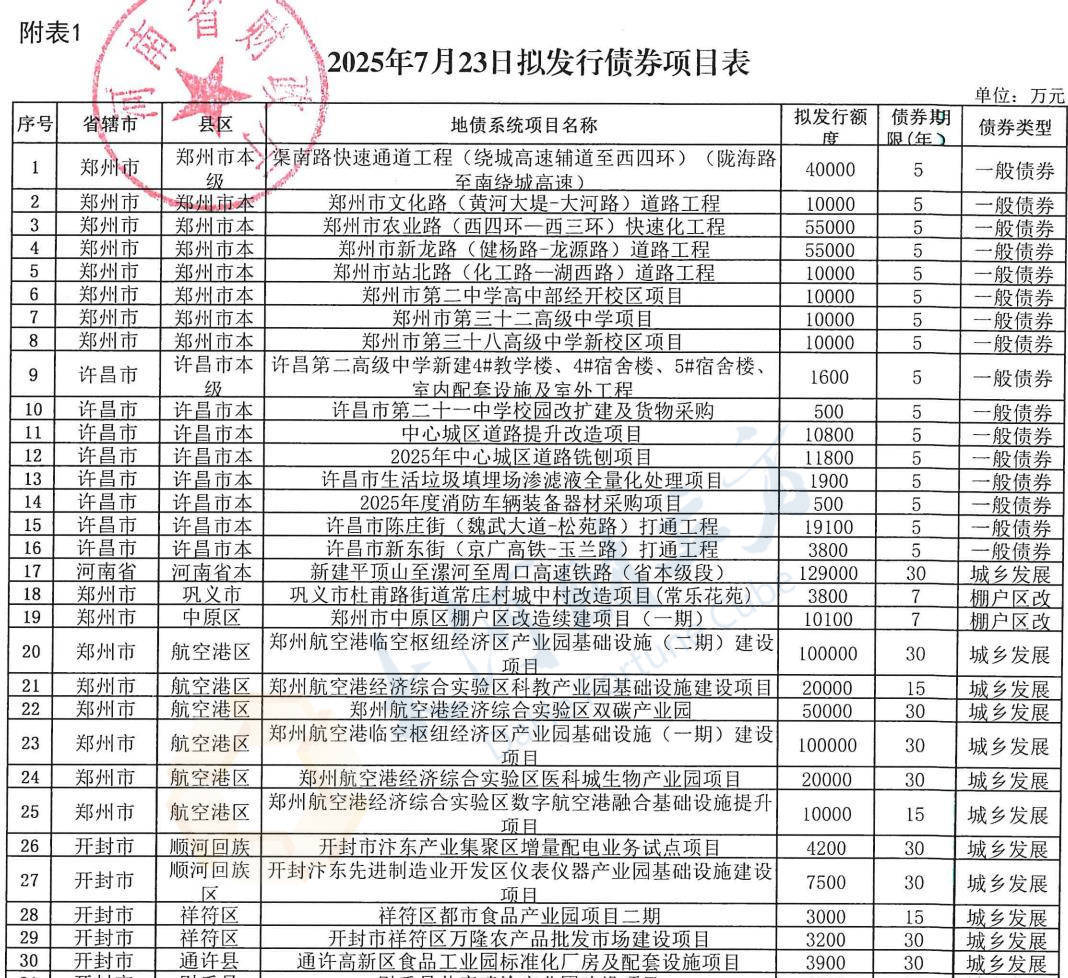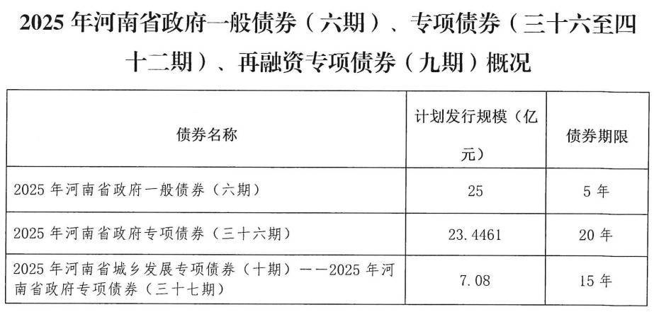 【大河财立方消息】7月16日,河南省财政厅发布2025年河南省政府一般债券(六期)、专项债券(三十六至四十二期)、再融资专项债券(九期)信息披露文件。
