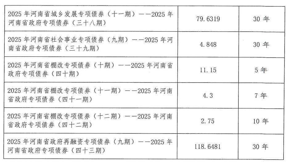 2025年河南省政府一般债券(六期),主要用于交通教育等建设项目;2025年河南省政府专项债券(三十七至四十二期),主要用于城乡发展、社会事业、棚户区改造等领域;2025年河南省政府再融资专项债券(九期),用于置换存量隐性债务。