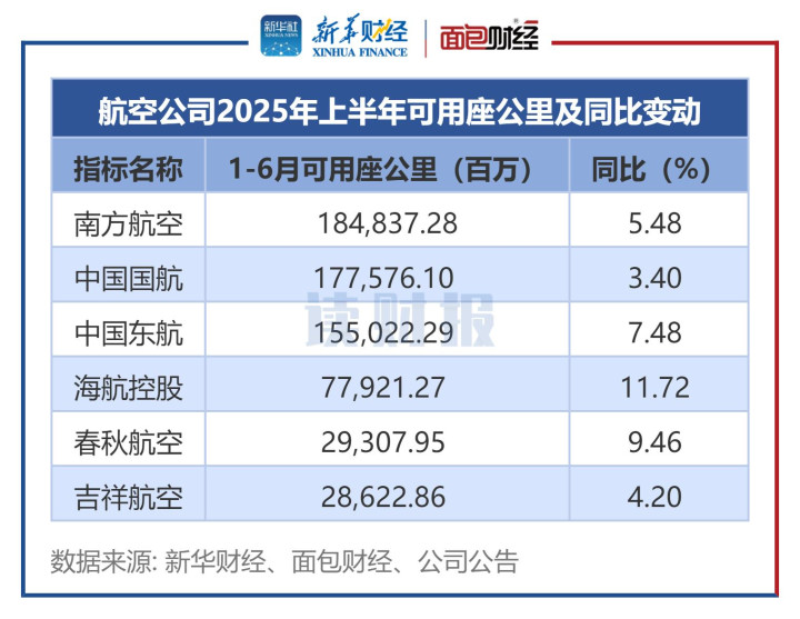 从增幅来看,6家航空公司2025年前6月的可用座公里累计值同比均上升。