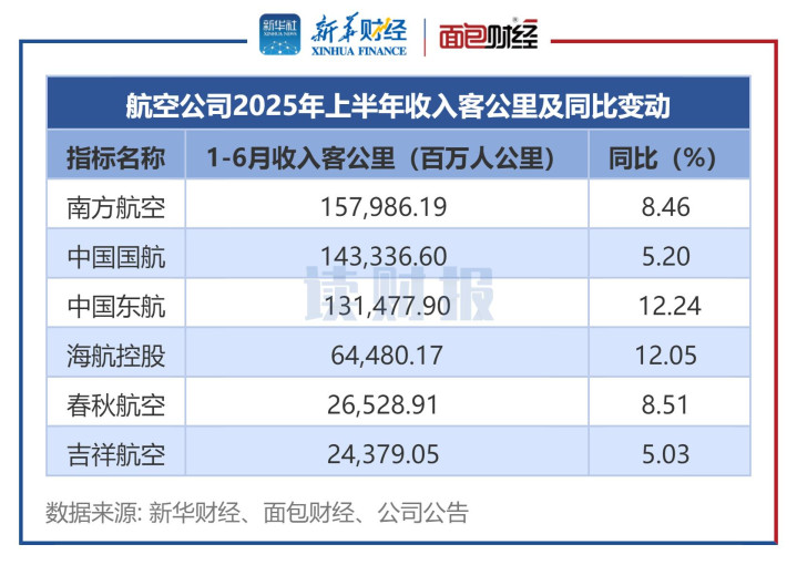 从同比增幅来看,6家航空公司2025年上半年收入客公里累计值同比均有增加。