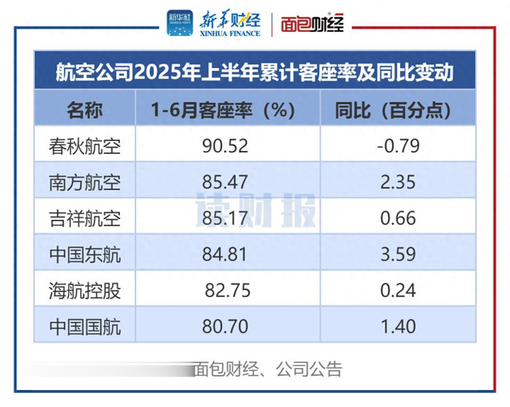 根据公告数据,2025年上半年,春秋航空累计客座率居首,达90.52%。南方航空紧随其后,上半年客座率达到85.47%。